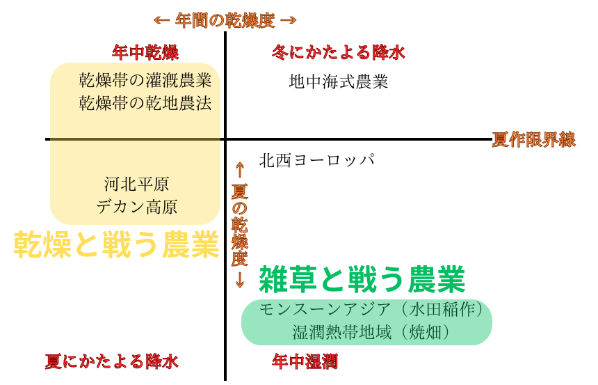 つまり、「焼畑」と「湿潤気候での水田稲作」は同じカテゴリーに分けることができる。