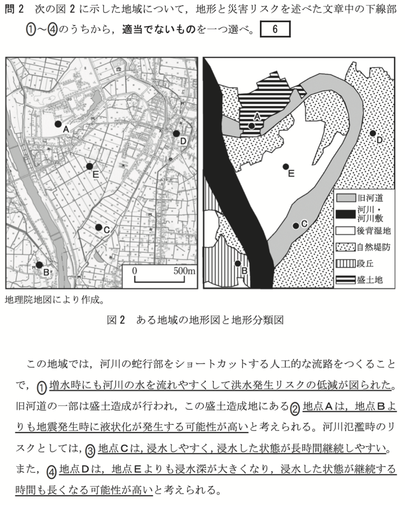④ 地点Dは自然堤防上、地点Eは後背湿地にある。すると、当然地点Eの方が標高が低い。地形図でも地点Eは水田になっている。したがって、地点Eの方が浸水深が大きくなり、浸水した状態が継続する時間も長い。誤文。