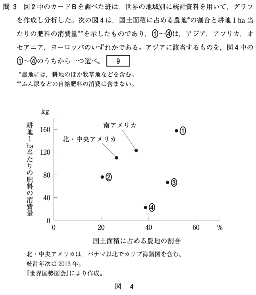 肥料の使用量が多いのはアジアの農業の特色なので、①。