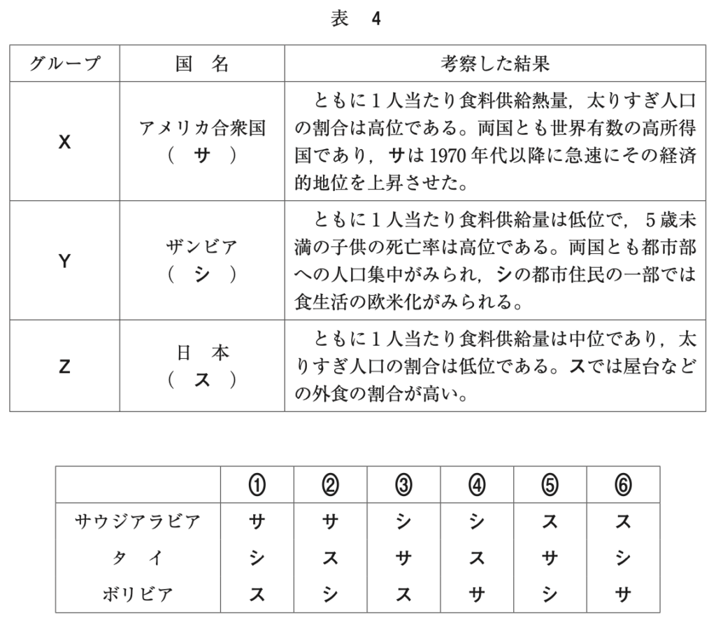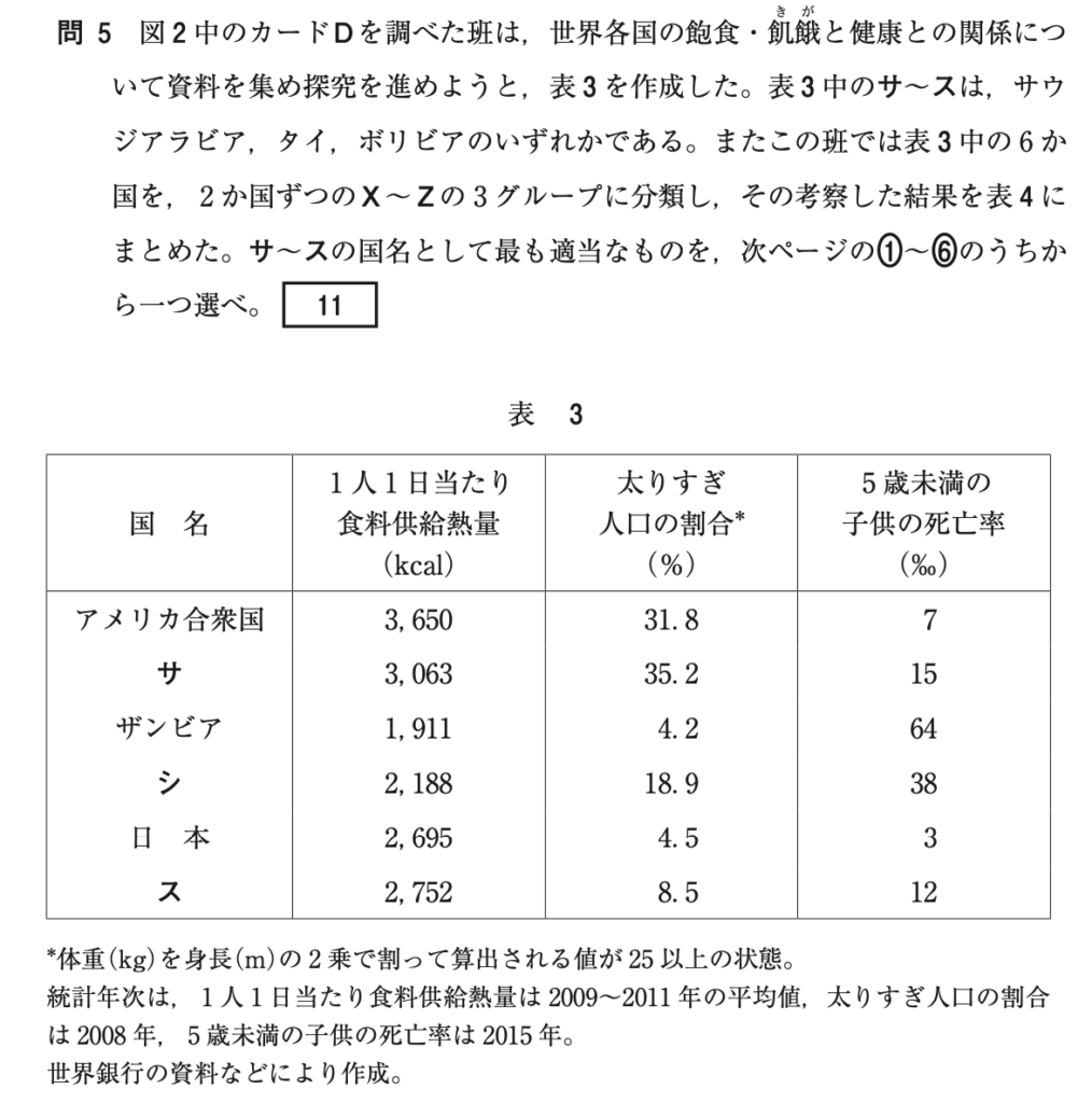 次にシ。一人当たり食料供給量が低位で、5歳未満の死亡率が高位とある。ここから非常に貧しい国であることがわかる。タイとボリビアでどちらが貧しいかだが、タイは近年工業化が進んでいる国なので、よくわからないけどきっとボリビアだろう、で大丈夫。