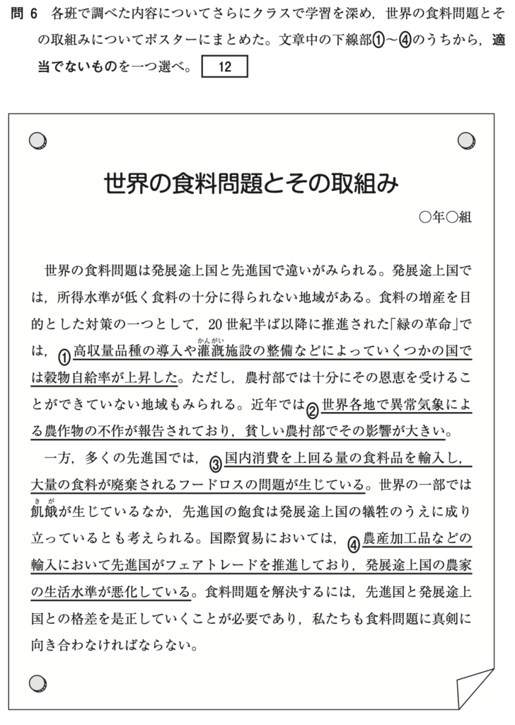 ①は緑の革命を復習しましょう。②は農作物の不作により先進国の都市部で物価上昇が起こるなど影響があると考えられるが、当然それ以上に苦しいのは農村部。③はまさにこの文章の通り。フードロスという言葉をしっかりと覚えてください。