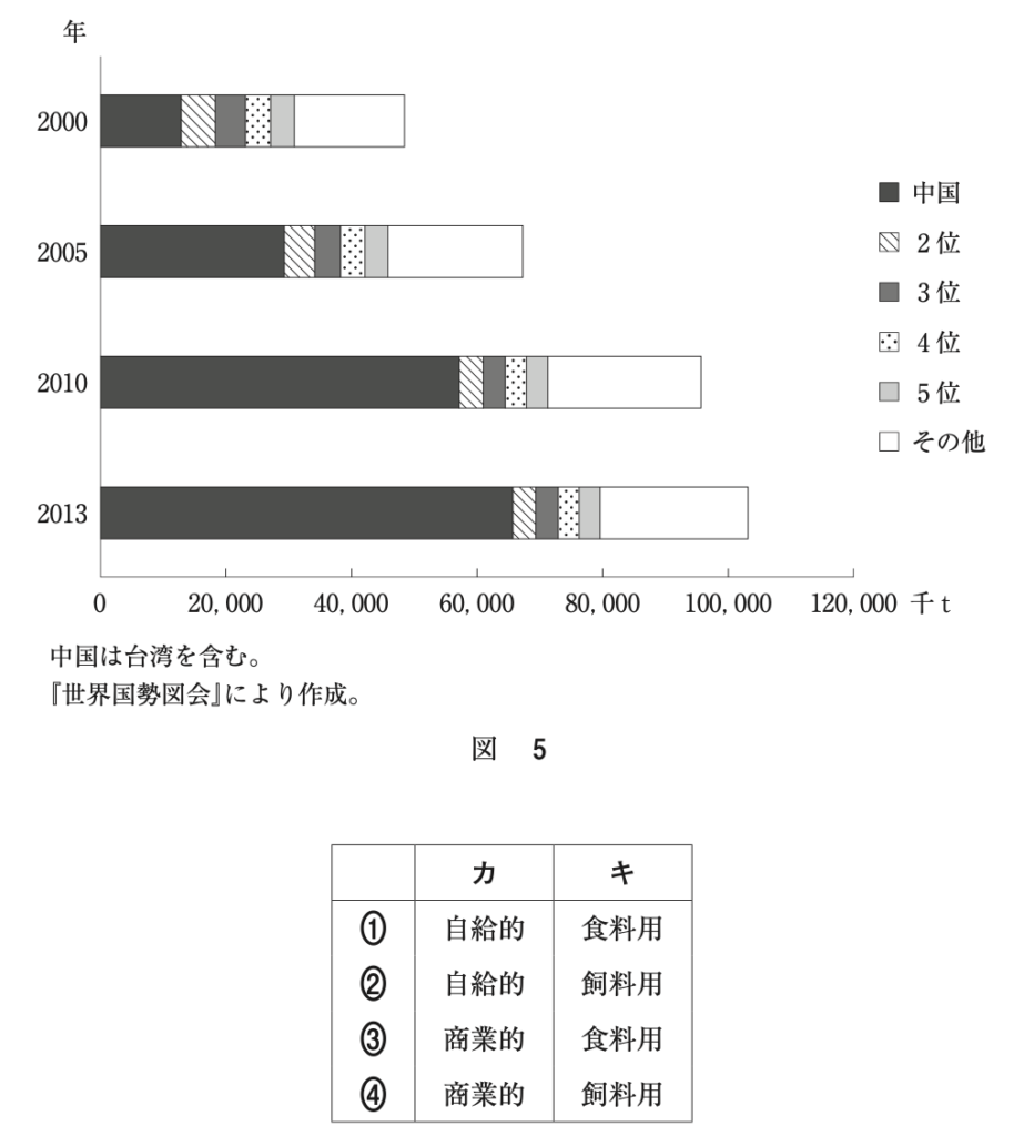 カは「生産量に占める輸出量の割合が小さい」とあるので、国内で消費しているということ。