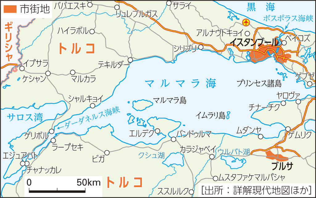 • トルコの都市(6 ●●● )は、アジアとヨーロッパの二つの大陸にまたがって位置しています。